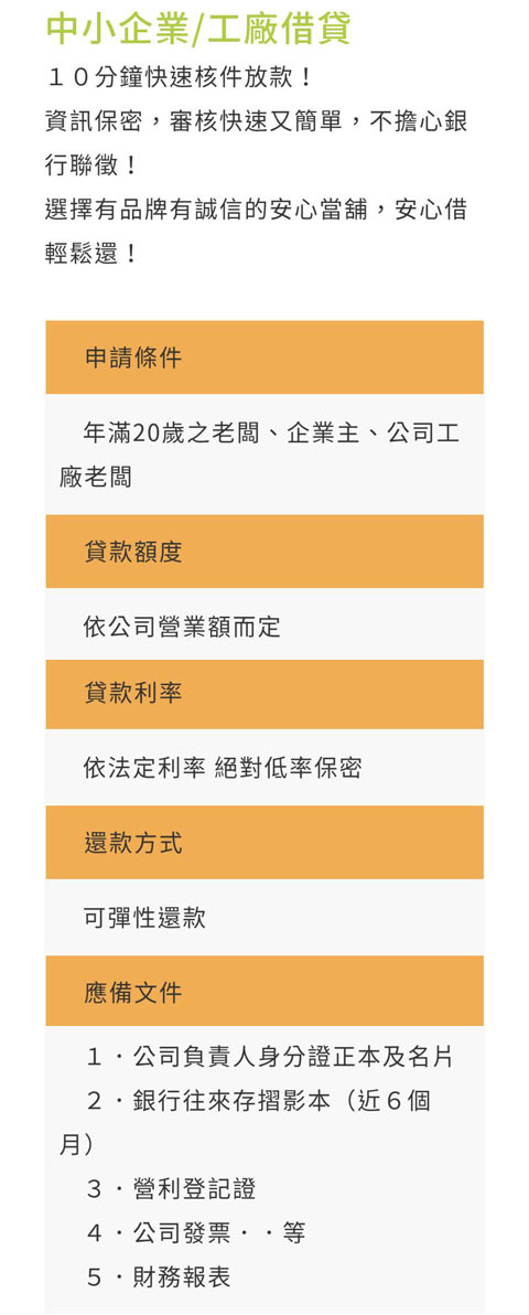 來幫你不論借款或是需要大同區借錢和借錢救急的客戶、提供汽車機車借款、融資、典當、支票貼現、創業貸款、流當品拍賣及資金週轉等服務。工商......